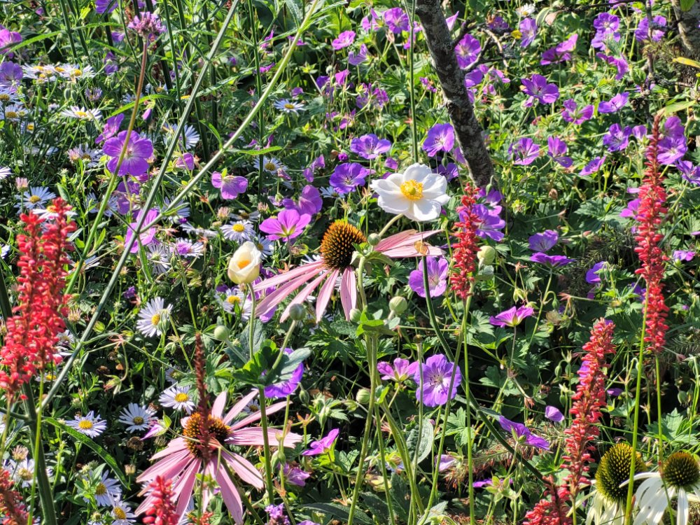 Die Herbstastern legen erst ganz Verhalten los mit der Blüte, die Gräser sind prächtig und die bereits einsetzende Gehölzfärbung schafft eine frühherbstliche Stimmung.