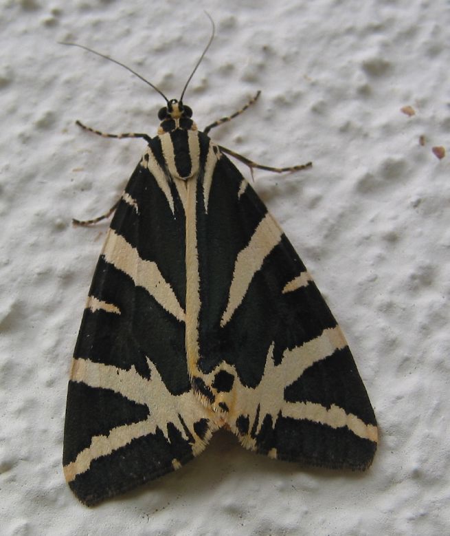 Russischer Bär Euplagia quadripunctariaDas Foto zeigt den Falter in Ruhestellung. Eine große Population befindet sich auf der griechischen Insel Rhodos. Sie ist dort namensgebend für das Petaloudes (Schmetterlingstal), welches aufgrund der zahlreichen harzreichen Orientalischen Amberbäumen die Schmetterlinge anlockt und zur Fortpflanzung animiert. Berühmt wurde das Petaloudes durch den israelischen Satiriker Ephraim Kishon, der in einem seiner Bücher nicht glauben konnte, dass in diesem Tal tatsächlich Schmetterlinge zu finden sind.