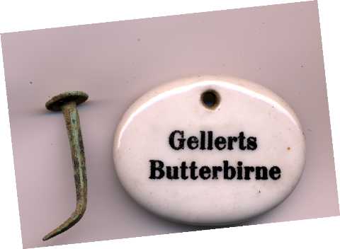 das sind weiße Porzellanschilder welche schwarz beschriftet sind. Hier noch einmal zwei Fundstücke.Die Annanasrenette existiert noch als ca. 100 järiger Baum im Obstgarten. Das Sortenschild fand ich weit entfernt beim Ausheben eines Pflanzloches. Das andere beschädigte Schild in einem ganz anderen Gartenteil beim Anlegen eines Zierrasen.