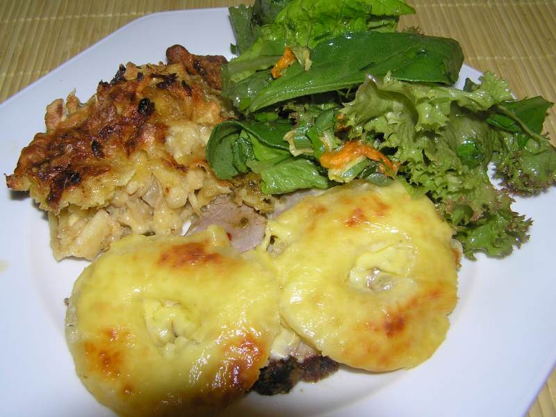 eine eigenwillige kombination "quer durch den kühlschrank".bratenreste mit ananas und käse überbacken, dazu die restlichen kässpätzle und gartensalat.hauptsache die reste sind erstmal wieder weg