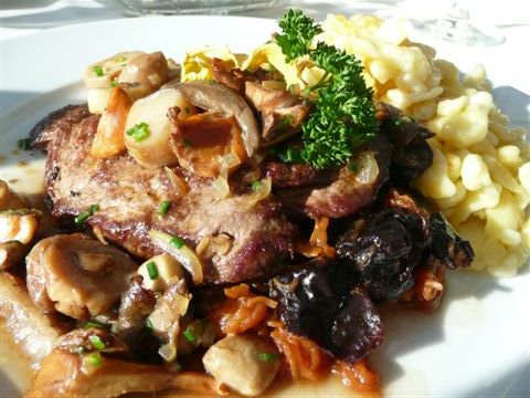 ... das herrliche Wetter hat mich nach draussen gelockt, darum war ich auswärts essen, es gab: Selleriemousse auf BlattsalatRehschnitzel auf einem zu weichen Kürbisgemüse mit Pflaumen, dazu Waldpilze und Spätzle