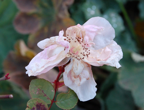 Die Goldelse sieht trotzdem sehr schön aus.Heute ist die Souvenir de St. Anne endlich in den Boden eingezogen. Zuerst musste ein selbstgezogenes Nostalgiebäumchen den Platz räumen, es zieht zu einer Freundin.Souvenir de St. Anne und die hochberühmte "schmunzel" SDM stehen sich nun rechts und links vom Weglein gegenüber. Die Mutter kann jetzt über ihr Töchterchen wachen.Aber was eigentlich das faszinierende an der SdSTA ist: sie duftet und das bei praktisch 0 Grad, sie duftet so stark wie Hyazinthen. Kaum zu glauben, dabei ist sie am Verwelken. Hier das Foto: