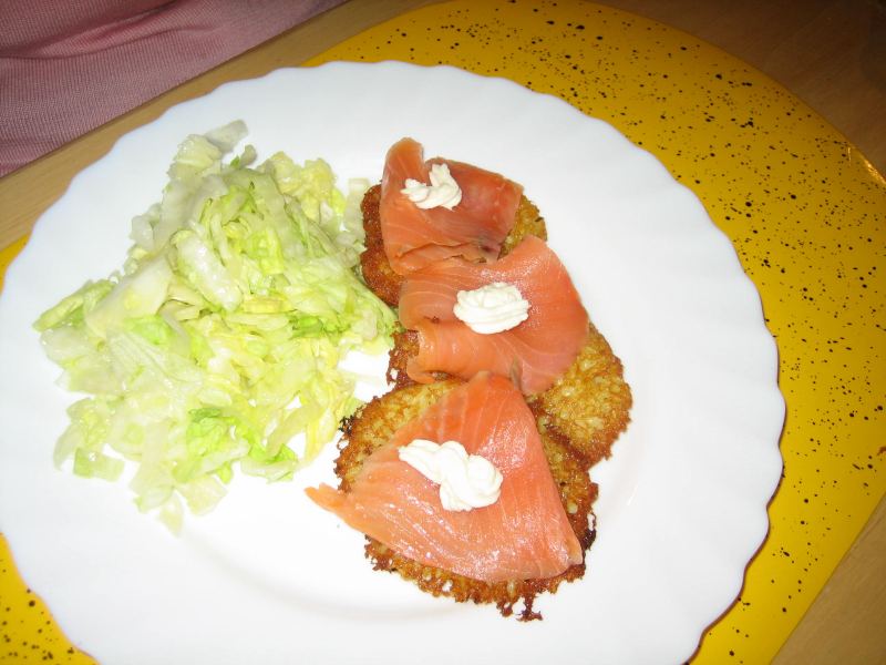 Gestern Abend wurde ich von GG bekocht, es gab Karoffelpuffer mit Lachs und Salat ;DWar sehr lecker!