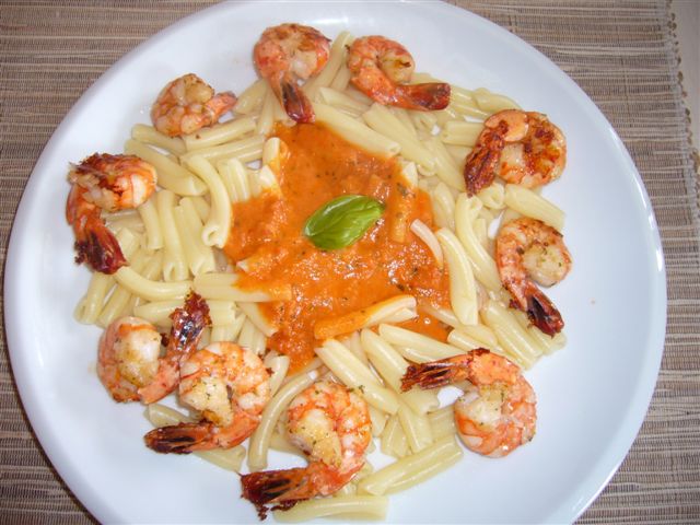 es gab:Nüsslisalat (Feldsalat) mit Bärlauch-Crouton gebratene Scampi, Teigwaren mit pikanter PaprikasauceRhabarber-Sorbet mit etwas Champagner .... Scampi aus Italien, Paprikasauce und Rhabarber für das Sorbet aus dem Tiefkühler