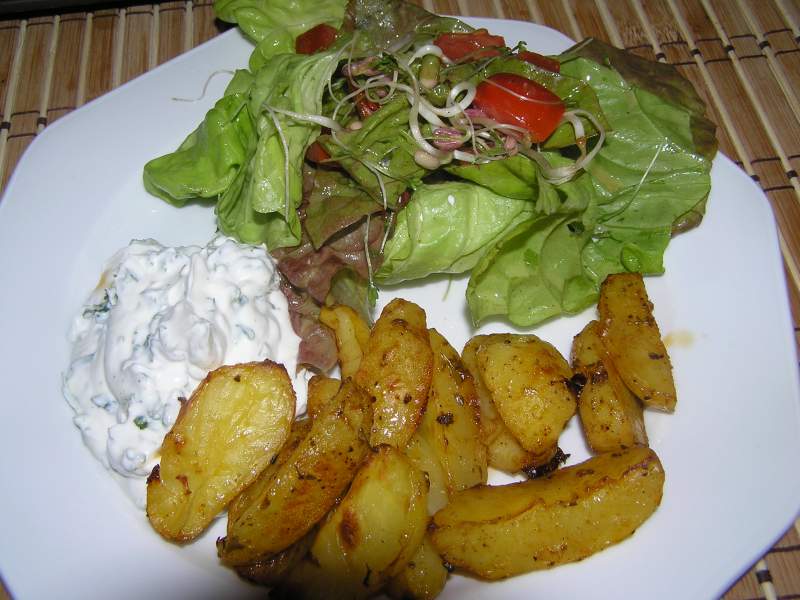 nach der völlerei am wochenende gab es heute marinierte kartoffelecken aus dem ofen, dazu kräuterquark und gartensalätle.