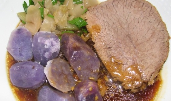 heute gab es falsche lende vom rind. dazu vitelotte-kartoffeln. als gemuese senfkohl (konserve) mit blattpetersilie.