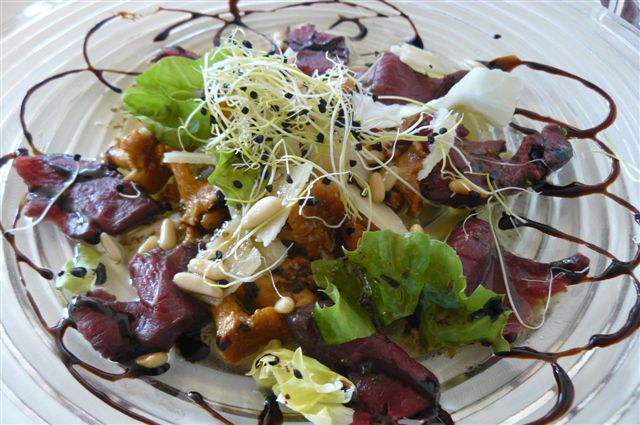 ich war auswärts, es gab ein:Hirsch-Carpaccio, auf Pfifferlingen, Hobelkäse und gerösteten Pinienkernen