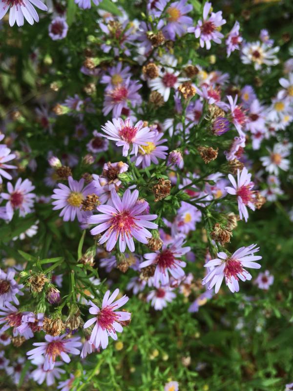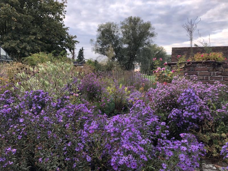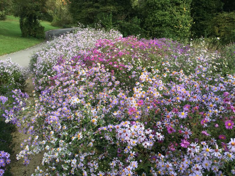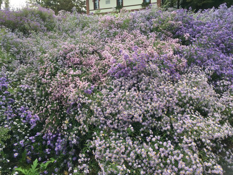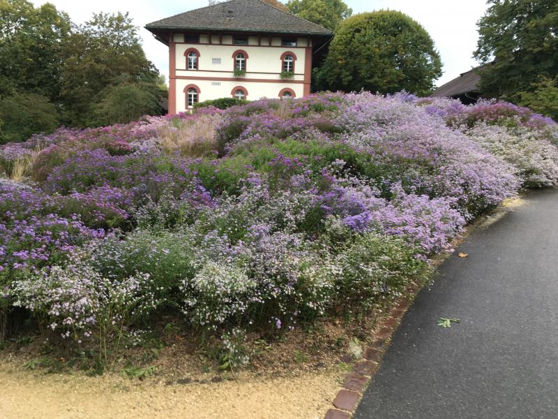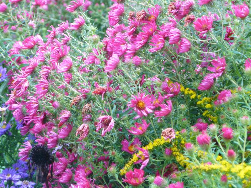Das Riesenteil im Hintergrund ist 'Arcturus’, eine der wenigen Sorten, die sich in dem Gewühl absetzt. Dunkle Stiele! Und sie produziert wunderschöne Sämlinge, die meisten bisher leider mehltauanfällig.