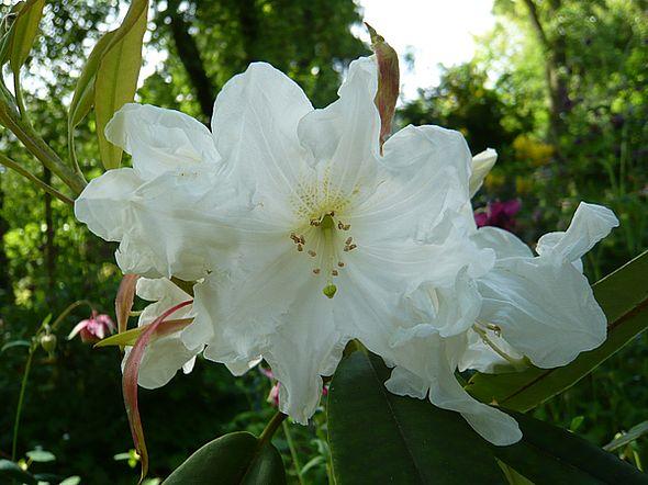 Riesige Blüten mit einem schweren, würzigen aber gut zu ertragenden Duft, der weit trägt: Das ist Rhododendon decorum.Leider lässt seine Winterhärte ein wenig zu wünschen übrig. Für kalte Gärten ist er nicht geeignet. Wer aber eine geschützte Ecke hat, erfreut sich an einer sehr schnell wachsenden Pflanze, die bereits nach 2-3 Jahren zu blühen beginnt. Meiner hat inzwischen 2,50 m erreicht und schon zahlreiche Abkömmlinge.