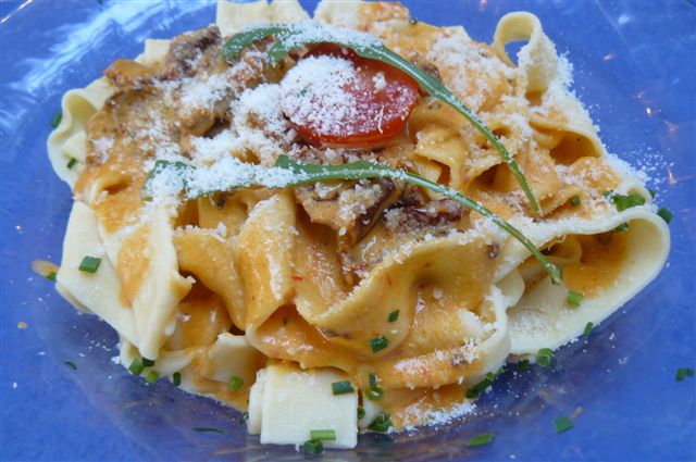 heute früh bin ich ins Toggenburg gefahren, kurz vor der Abfahrt sagte mein bester Freund: ".. und schiess ein Foto für die Fans der blauen Teller", das habe ich natürlich liebend gerne gemacht.es gab einen bunten Blattsalathausgemachte frische Nudeln an eine Paprikaschaum-Sauce