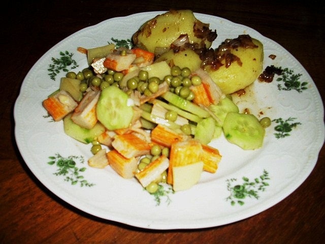 hier gab´s heute:pellkartoffeln mit öl-zwiebelsoße und einen surimisalat mit erbsen und gurken.
