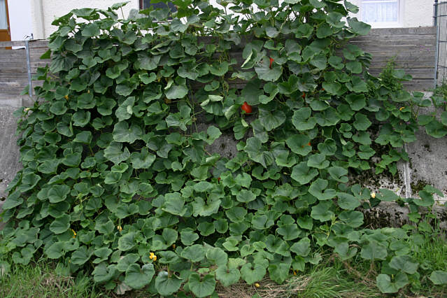 Hallo AnneRosmarin !So ca. 5-6 m lang ist sie geworden. Die Kürbispflanze ist hinten zum Bach runtergewachsen, sie liegt auf dem Betonrand vom Bachbett auf und wächst richtig in den Bach rein. Sie hat ja noch einige Kürbisse dran, die waren aber noch nicht ausgereigt, sie sind noch gelb und werden erst noch orange. Auf dem Bild kannst Du es sehen. lg. elis