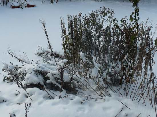 Nein, das ist nicht meine Schmuddelecke, das ist ein Staudenbeet nach Aufprall mehrerer Dachlawinen