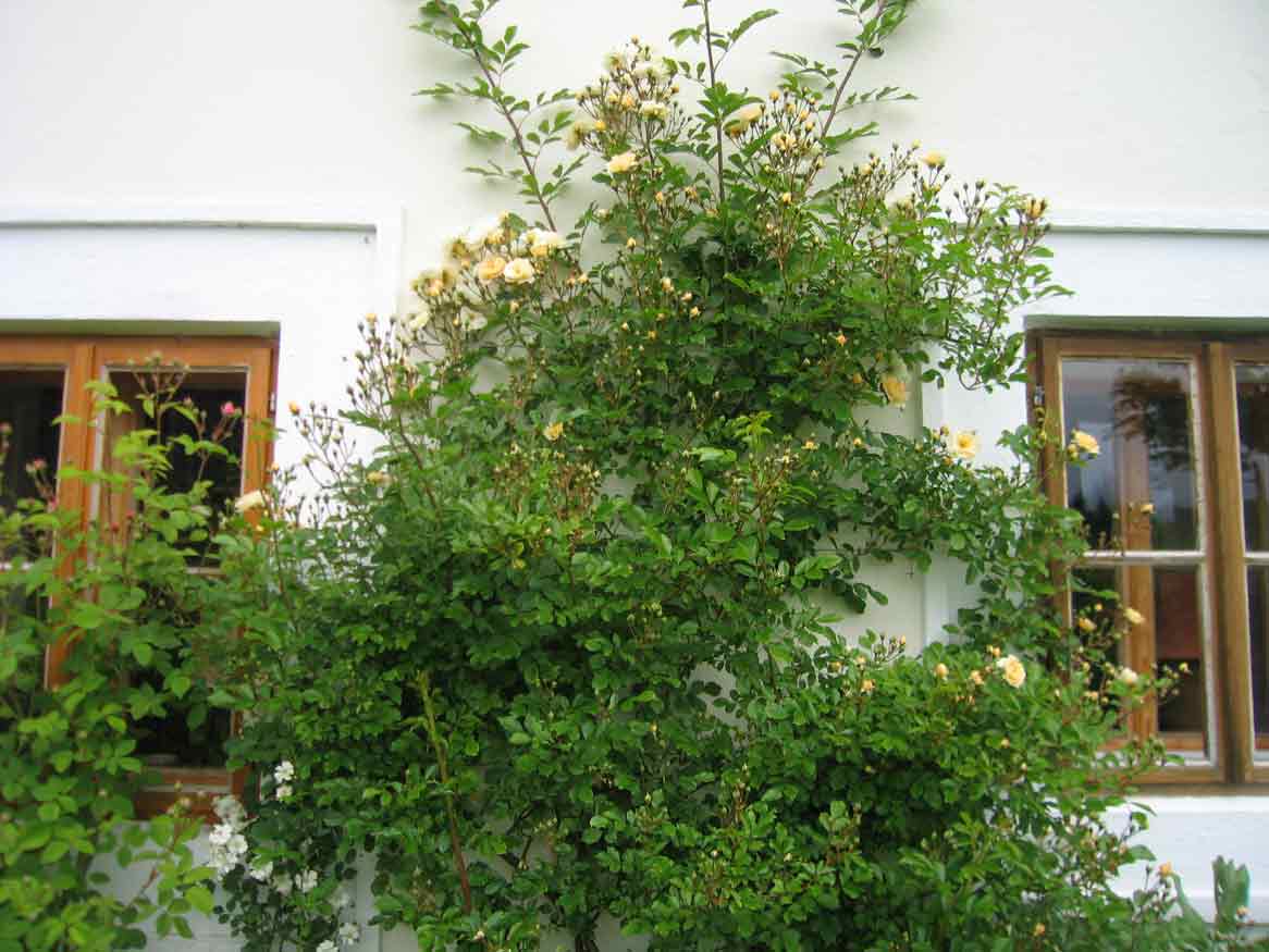 Mau, der Goldfinch macht sogar bei mir 6 m lange Triebe. Die muß ich im Frühjahr immer mehr oder weniger zurückschneiden, aber bei dir wäre das ja wohl kaum der Fall. Hier ein ganz schlechtes Bild vom September, bevor er eine neue Etage Draht bekommen hat.Goldfinch ist unter den dornenlosen nicht aufgelistet, steht aber bei den anderen Ramblern und ist dort höher als bei HMF angegeben, nämlich doch mit 5m. - Da kenn' sich wer aus. Aber darum fragt man hier.![]()