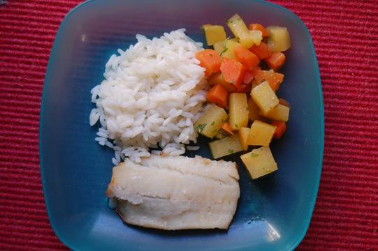 Heute gab es Schollenfilet mit Zitronensalz, Lorbeerreis und Steckrüben-Mohrrübengemüse.