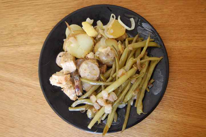 Hier gab es Speckbohnen, Bratkartoffeln und Grillfleisch/würstchenpfanne (Resteessen