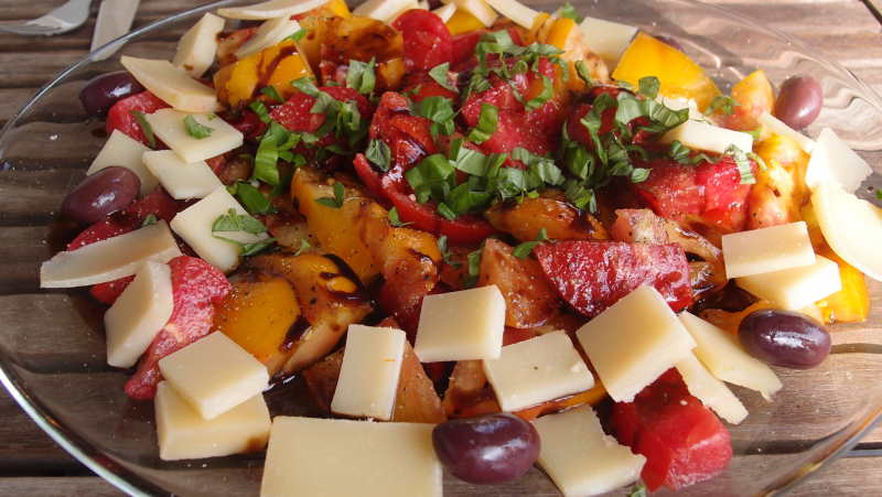 ...und dazu bunter tomatensalat mit basilikum, oliven und parmesan
