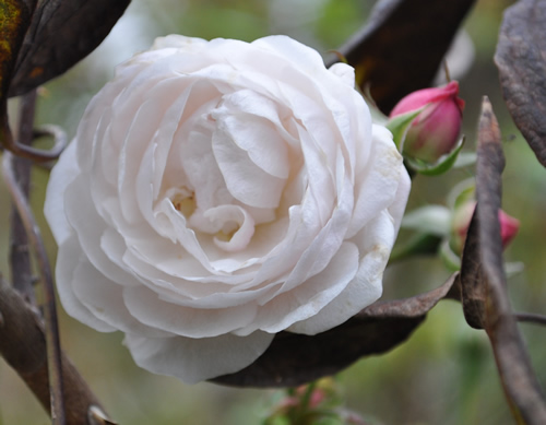 Mme Blanche Lafitte scheints nicht zu stören zwischen braunen Clematisblättern eine Blüte hinzuhängen:
