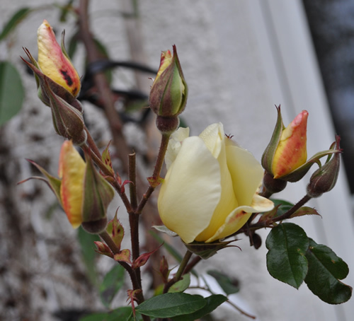 Einige Rosen haben immer noch Blüten. Ist ja auch noch nie so richtig kalt gewesen und Nebel macht ihnen offenbar nichts aus, trotzdem die Blüten öffnen.Mary Rose