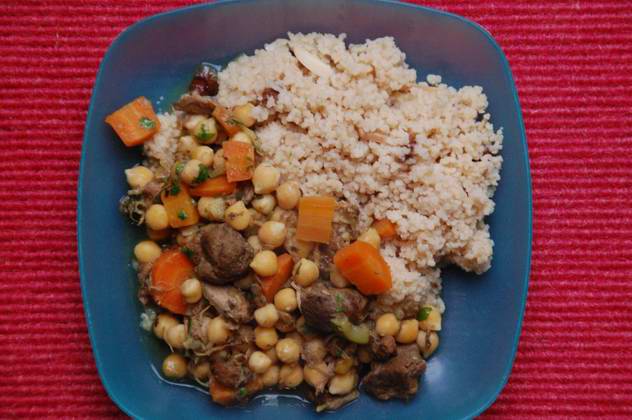 .Hier gab es marokkanischen Ententopf mit Rosinen-Mandel-Couscous (der Rest vom Sonntagsessen