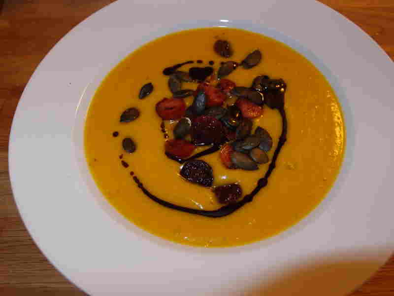 kürbissuppe mit gebratenen debrezinerscheibchen und baguette
