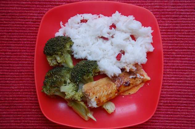 .Zum Mittag gab es Pangasius mit Granatapfelreis und Broccoli.