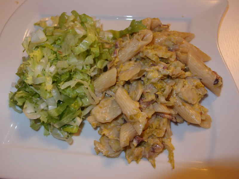 gestern gab es penne mit rosenkohlspecksahnesoße und endiviensalat