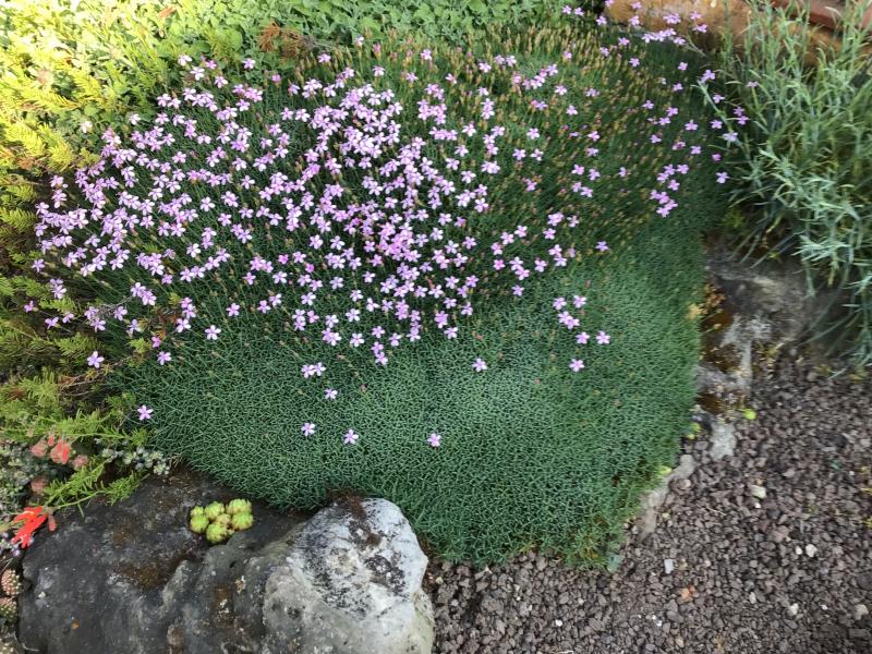 D. microlepis blüht jetzt auch. Gilt als etwas blühfaul, wobei es in diesem Jahr nur für die Hälfte des Polsters gilt. Trotz der Zartheit hat es eine ziemliche Wuchskraft und hat ganzjährig ein schönes Polster. Ich habe den Platzbedarf beim Kauf unterschätz, so kommt es nun zu Rangelei mit den Nachbarn