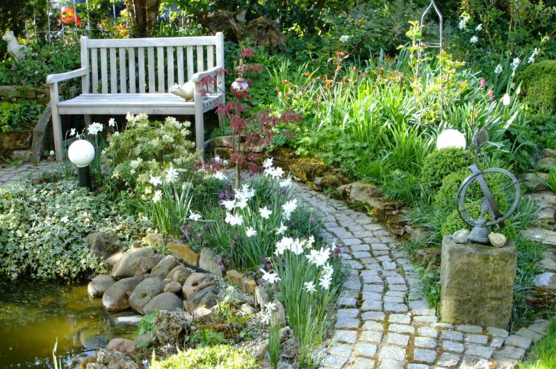 Von meinen Wildtulpen sehe ich fast nichts mehr, außerdem blühen sie doch recht kurz.Die Narzisse Thalia habe ich bei einer Gartenreise nach Holland so oft gesehen, daß sie auch unbedingt in meinen Garten musste.So habe ich den Randbereich des Gartenteiches von dem ganzen verwurzelten Zeug befreit, eine Kapillarsperre eingebaut und im Frühjahr sieht es so aus: