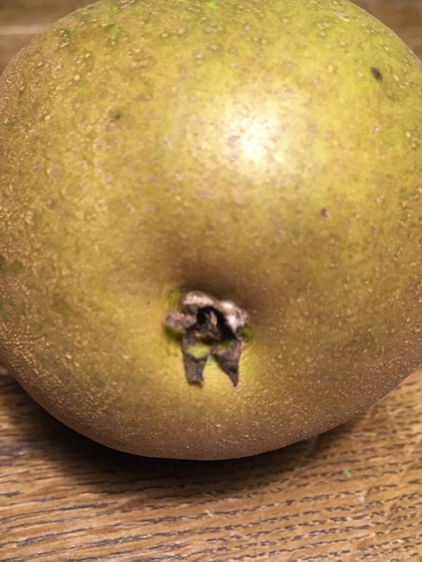 Die Pastorenbirne hat neben dem typischen Roststrich auch noch den sehr flachen Kelch mit langen Kelchblättern die einem Seestern ähneln.