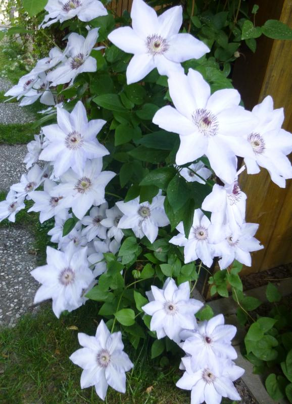 Erstaunlich, dass sie an dem Platz so gut zurechtkommt. Hast Du einfach nur eine Platte herausgenommen und die Clematis hineingepflanzt? Wie oft muss Du dort gießen? Woran rankt sie?