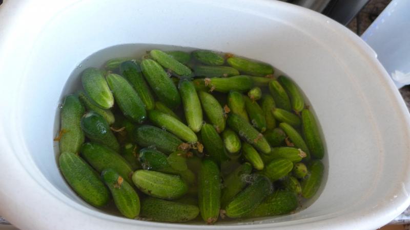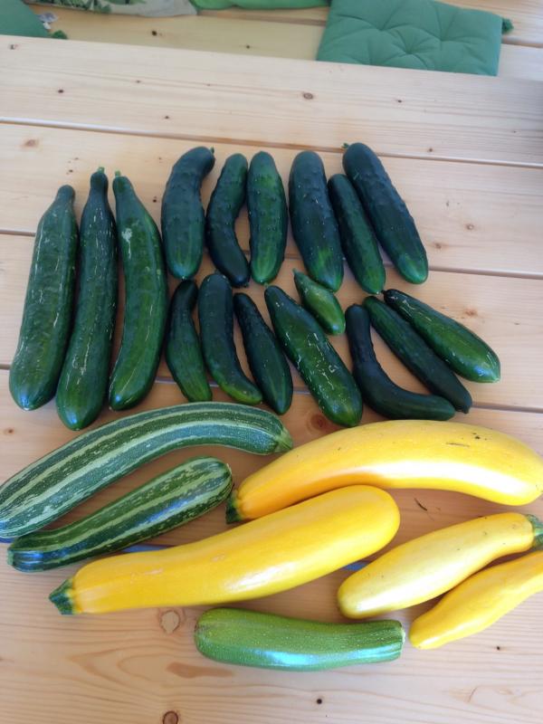 Buschbohnen, Gurken, Gurken, Gurken, handvoll Erdbeeren, einen Eimer voll Laccinato zum Trocknen