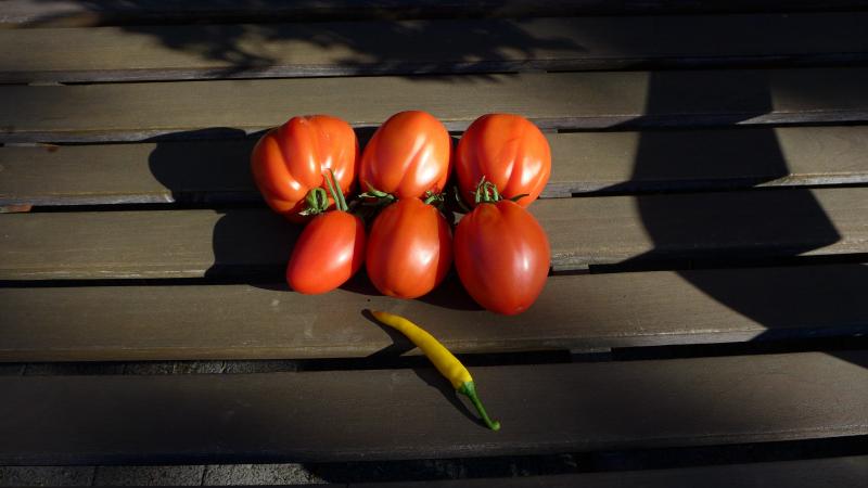 gestern abend Blaubeeren, einen Liter, reichlich Tomaten, inzwischen auch grosse Varianten,