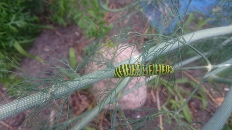 Eine Dillpflanze muss zweimal von einem schwalbenschwanz besucht worden sein. Es fand sich diese große Raupe ohne Appetit und eine noch recht kleine mit viel Appetit.