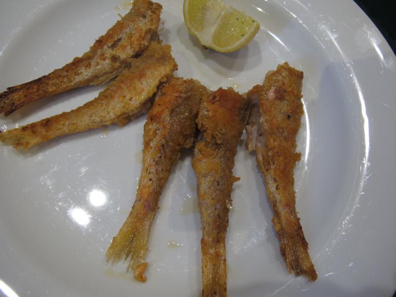 Und heute wollte ich beim kroatischen Fischhändler eigentlich nur Käse kaufen, da die frische Lieferung meist Donnerstag Nachmittag kommt, aber da häuften sich schon Berge von tagfrischem Meeresgetier, Scampi, Brassen, Wolfsbarsche und - kleine Streifenbarben. Die mußten mit :D Dazu gab es Salat aus dem Garten und frisches Weißbrot.