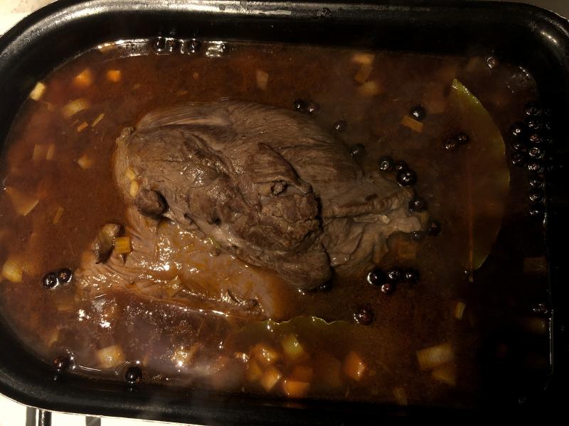 beim nochwasnachkauf fiel mir dann auch noch eine rehkeule im angebot auf, die kam mit mirepoix in den ofen...