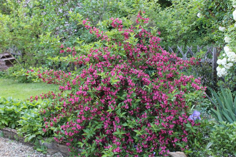 und die Weigelie, die ist richtig laut, weil lauter dicke Hummeln in die Blüten krabbeln.