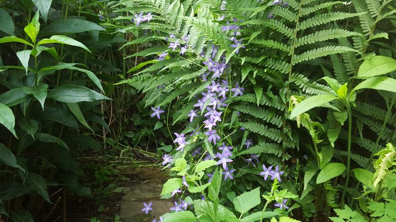 Campanula portenschlagiana ( oder porschaskyana…. ), einen Farn durchwebend.