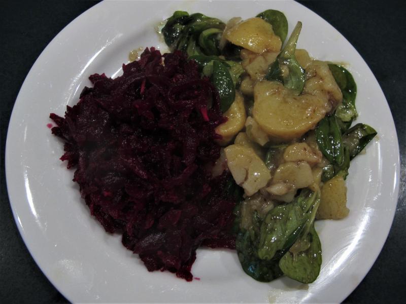 und heute karpfenfilet gebacken mit erdäpfelvogerl- und rote rübensalat.