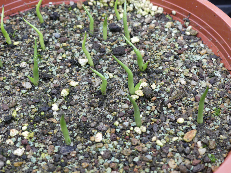 Das Keimungsverhalten ist wohl zwischen den vier Varianten nicht grundsätzlich verschieden. Die draußen überwinterten Behälter sind weiter entwickelt. In den frostfrei gehaltenen gibt es gerade einen neuen Keimungsschub. Die Pulpa scheint keine grundlegend keimungshemmende Wirkung zu haben. (Die verkrümmten Blätter kommen von den Gefäßdeckeln, die ich lange Zeit auf den Behältern gelassen hatte.)