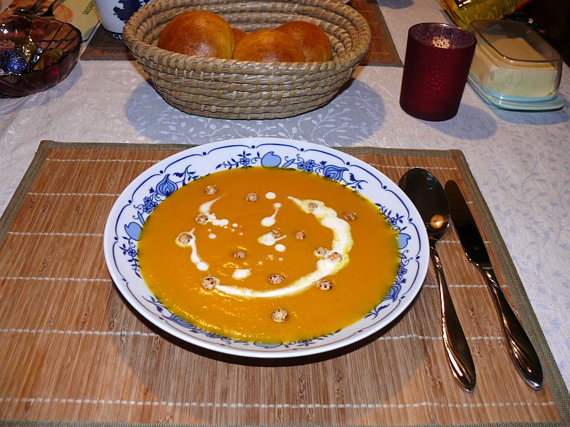Kürbissuppe mit Kokosmilch, Ingwer und Knoblauch (Olivenöl, S&P, Karotte, Sellerie, Zwiebel, Kartoffel, Sahne) dazu Kürbis-Milchbrötchen.