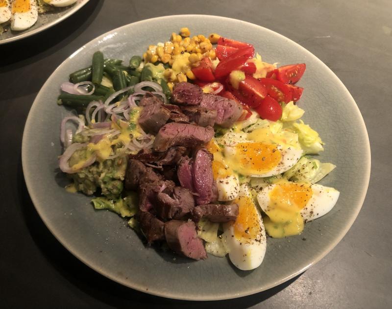 Aber es gab Bohnen (im Originalrezept grüner Spargel), Mais in Öl gebraten, Datteltomaten, hart gekochte Eier, Avokado, Zwiebeln, Rehfilets und darunter Eisbergsalat mit Koriander und dem Dressing vermischt.