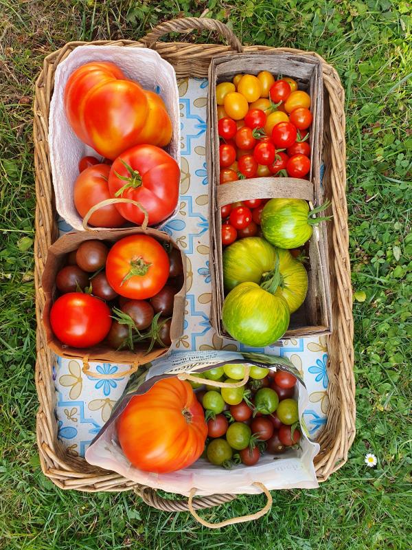 Halb rechts die gelbgrünen größeren sind Green Zebra, die mag ich sehr. Der Knaller dieses Jahr sind aber die Green Doctors, quietschgrün reifende Kirschtomaten, die absolut köstlich sind! (Unten rechts)