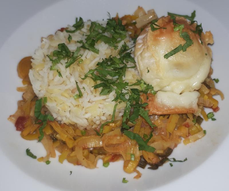 Heute gab's Bulgur-Reis auf Tomaten-Porree mit gebackenem Ziegenkäse