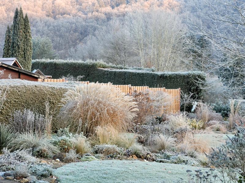 Wie es aussieht, soll es jetzt erstmal für ein paar Tage keine Niederschläge geben, vom mir aus braucht es im Dezember auch gar nicht mehr zu regnen. Aber wenn nun der Boden etwas anfriert, kann ich endlich die restlichen kreuz und quer liegenden Staudenstängel zurückschneiden und häckseln, und irgendwann muss ich auch die Haseln sowie die Tamariske auslichten, da gibt's dann wieder reichlich Holzhäcksel für die Wege rund ums Gartenhaus und den Kompostplatz. Man kann sich ja warm anziehen, und beim Arbeiten wird's einem ohnehin warm, nur diese ewige Nässe zieht immer bis in die Knochen und ist äußerst unangenehm.