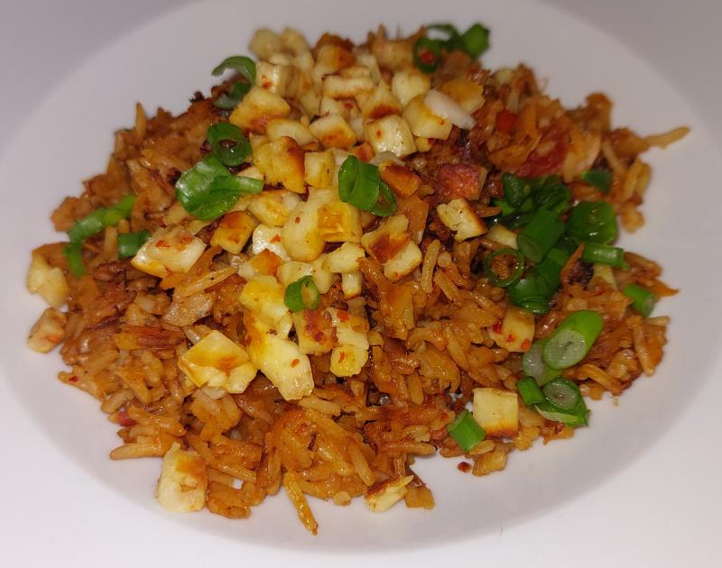Gebratener Reis mit Tomaten, Lauch, Paprika, Kohlrabi und gebratenem Halloumi