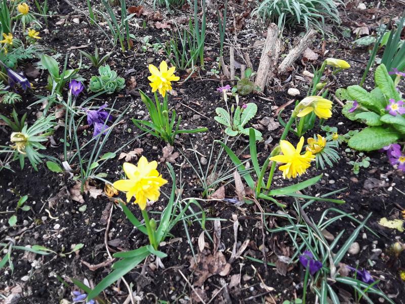 Kurzzeitiger Fastsonnenschein und schon bittet Narcissus 'Winter Walz' Tulipa 'Sunrise (die sich gestreckt hat) zum Tanz. (Den Baueimer für's Gezupfte hätte ich aus dem Bild nehmen können, naja, das ist das wahre Gartenleben...)