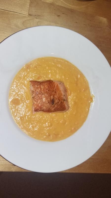 Hier gab es allerdings auch ein sehr leckeres Essen, Möhrensuppe (Knoblauch, gelbe Chili, Ingwer, Kartoffel, Sahne) mit Lachs (gebraten). Dummerweise hatte ich gerade heute vergessen, auf dem Markt Petersilie zu kaufen - schade für's Photo. ;) Aber Schnittlauch hätte wohl eh besser gepasst.