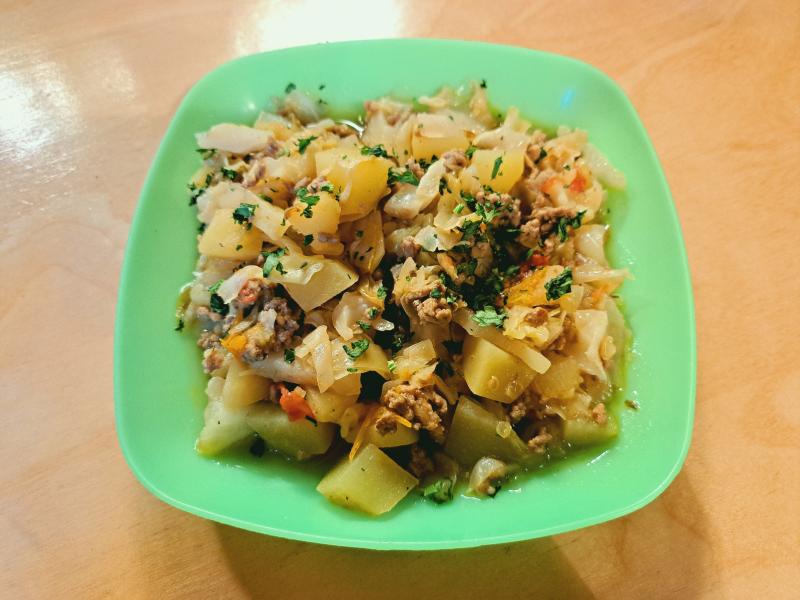 Heute gab es Schmorkohl. Diesmal aus Spitzkohl und bunten Tomaten.