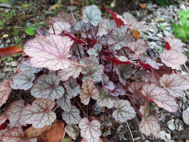 Hier gedeihen Heuchera ganz gut und versamen sich auch gerne. Ich hatte ja neulich einmal einige Sämlinge aus dem Vorgarten gezeigt. :D Hier nun einige besondere Heuchera mit auffälligem Laub. Leider meist ohne Sortenbezeichnung... :P Hier irgendwas wie Caramella oder so. :D